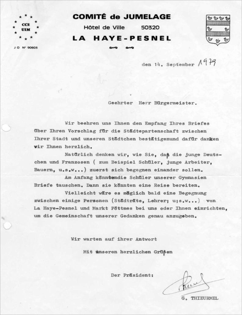Im September 1979 schrieb der damalige Präsident des Partnerschaftskomitees Georg Thieurmel den ersten Brief an die Gemeinde Pöttmes und bedankte sich herzlich für die geplante Städtepartnerschaft. Auffallendes Merkmal dieses Briefs: Es war bereits mit einem gedruckten Briefkopf des „Comité de Jumelage“ versehen. Es gab also zu diesem Zeitpunkt in La Haye Pesnel schon ein Komitee, das sich ganz speziell mit der Partnerschaft befasste. Der erste Besuch fand schließlich am 16.02.1980 in Pöttmes statt. Sechs Personen aus La Haye Pesnel kamen mit dem Zug in Augsburg an. Die sechsköpfige Delegation erlebte von Faschingssamstag bis Rosenmontag das bayerische Faschingstreiben.